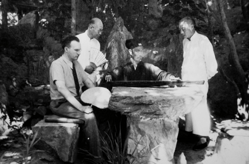 Fotografía de Robert van Gulik (izquierda) observando a un conocido tocar el qin en Beijing, China (1946). Fotografía disponible aquí.
