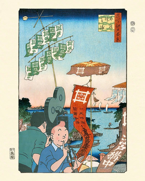 Bellver, combinando una fuerte influencia de las estampas de Hiroshige con los personajes de Hergé, utiliza una técnica que hay que destacar porque las estampas unen una gran labor artesanal con la tecnología. Hay que recordar que de Cien vistas de Edo fue una de las series más importantes realizadas dentro del grabado japonés del siglo XIX, en las cuales se representaban escenas populares y de género, así como paisajes, siempre imbuidas de una gran belleza y lirismo. En palabras de Fernando Bellver: «Me di cuenta que Hergé, en la representación de Tintin y los demás personajes, utilizaba una técnica muy similar». Se ve, pues, que la mezcla de ambos mundos ha dado un resultado muy interesante.