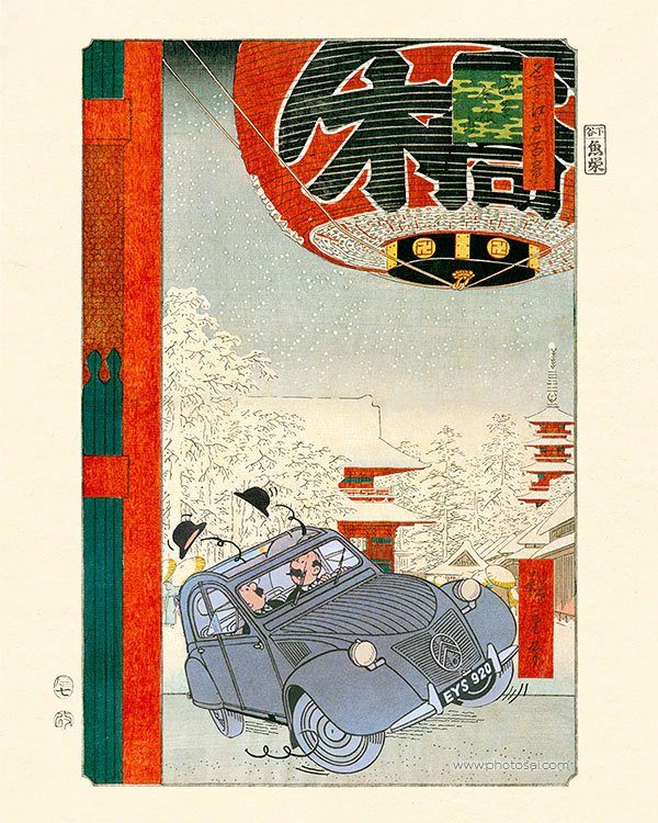 Durante sus estancias en Tokio, Bellver acostumbra a pasear por Nakamise Dori, la calle comercial en la que, entre otros, abundan los puestos que venden ukiyo-e, las imágenes del mundo flotante de los antiguos grabadores japoneses como Hiroshige. En esta estampa de sus 30 Vistas de Tokio, Bellver superpone la Kaminari Mon, la gran Puerta del Trueno, con Hernández y Fernández en precario equilibrio sobre un dos- caballos, sacando a la escena de la quietud intemporal otorgada por la nieve, y trayéndola al presente de nuestra contemplación. El 2CV contiene una alusión secreta al mismo coche adquirido por Bellver en 2014, quien le ha añadido al dibujo el hueco lateral para insertar el gato de cambiar las ruedas.