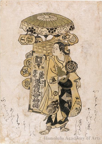 Pocos de los artistas del siglo XVIII, y menos aún de la escuela ukiyo-e (Toshinobu, Kiyomitsu, Horunobu, Koryûsai, Utamaro…), perdían la oportunidad de vender abanicos: se dice que los artistas famosos, incluidos los escritores, cuando necesitaban dinero hacían congregaciones en restaurantes donde pintaban abanicos para los clientes. El negocio era tan fructífero como común y nadie perdía la oportunidad de beneficiarse de él, incluso existían unos vendedores de uchiwas ambulantes, los jigami, que en cajas de laca trasportaban países y varas e iban en verano reclamando la atención de la gente gritando ¡Jigami! ¡Jigami!:uno de estos comerciantes es representado en un ukiyo-e anónimo datado hacia 1720 conservado en el Honolulu Museum of Art.