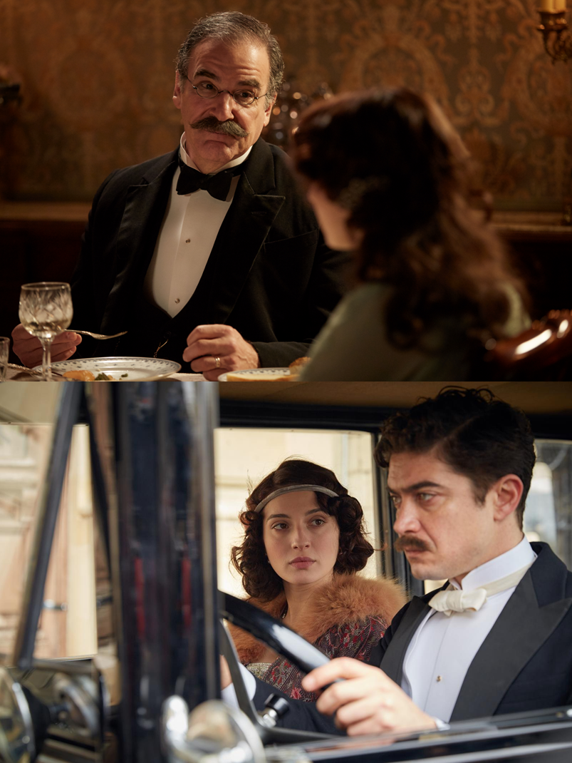 Arriba, el duque Kipiani (Mandy Patinkin) y su hija charlan durante una comida. Abajo, Nino y Malik (Riccardo Scamarcio) viajan en automóvil.
