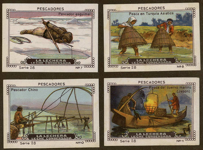 En la vigesimoctava serie, bajo el título Pescadores, se ilustran diferentes técnicas de pesca en función de la herramienta empleada (con red, con arpón…) o del pez (salmón, atún, etc.). A continuación, dentro de la misma serie se muestran algunos ejemplos de pescadores tradicionales y variaciones locales, entre los que aparecen pescadores chinos y la pesca del cuervo marino japonesa (si bien debería decir “con cuervo marino”, dado que se trata de una técnica milenaria para la que se emplean cormoranes). Nuevamente, entre las excepciones locales se busca la representatividad de culturas asiáticas para complementar la visión, en este caso, de algo aparentemente tan básico como la pesca.