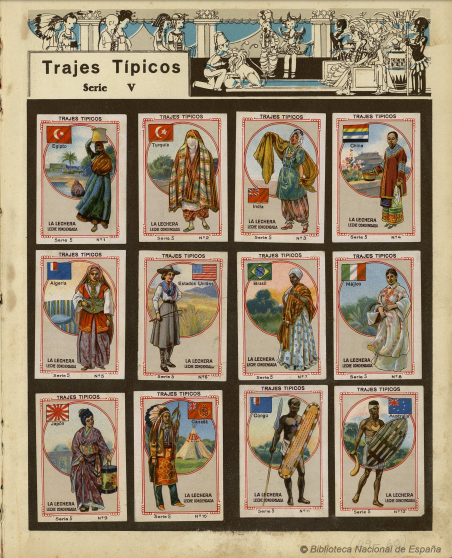 En este álbum encontramos varias referencias a culturas asiáticas, que contrastan llamativamente con el europeísmo reinante en otras series. La primera referencia, y una de las más extensas de este álbum, se encuentra en la quinta serie, dedicada a los trajes típicos. En esta página, bajo un encabezado que muestra una exótica recepción en un palacio a la que acuden personajes de distintos puntos del globo, muestra una colección de trajes, mayoritariamente femeninos, de Egipto, Turquía, India, China, Algeria (sic.), Estados Unidos, Brasil, México, Japón, Canadá, Congo y Australia. Cada cromo muestra a una figura ataviada con la vestimenta típica de la cultura a la que se alude, y como adelantábamos, son mayoritariamente figuras femeninas, aunque en algunos casos (especialmente, los dos últimos) se trata de hombres, para eliminar cualquier atisbo de desnudez impúdica.