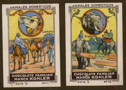 Un poco más adelante, la novena serie deja entrever también una cierta presencia oriental, en este caso mucho más sutil. Dedicada a los animales domésticos, dos de los cromos hacen referencia a animales exóticos al servicio del hombre: el camello y el elefante. El caso del camello podría resultar menos extraño, dado que, por su resistencia a climas desérticos, también tenía presencia en el norte de África y, por lo tanto, en el protectorado de Marruecos, un territorio mucho más próximo geográfica y culturalmente. Sin embargo, el elefante amaestrado es uno de los principales conceptos típicos y tópicos asociados a la India, donde existe una estrecha relación entre estos animales y sus cuidadores. En este sentido, resulta particularmente llamativo que aparezcan ambos ejemplos dentro de una colección que podía completarse únicamente atendiendo a animales cercanos, poniendo de manifiesto la voluntad de los editores por ofrecer una panorámica más amplia.