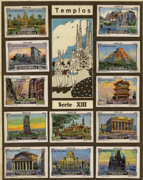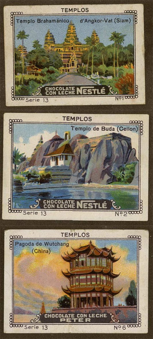 A continuación, es en la serie sobre templos del mundo donde encontramos nuevamente motivos asiáticos. En esta ocasión, se trata de templos de Siam, Ceilán (actual Sri Lanka) y China. Resulta además llamativo que estos ejemplos ocupen los números 1, 2 y 6 de una serie, por lo demás, bastante ecléctica, en la que tienen cabida obras tan dispares como las ya citadas, el Partenón de Atenas, la Basílica del Pilar de Zaragoza, una pirámide de Yucatán, San Basilio de Moscú o la Sagrada Familia de Barcelona, entre otras.