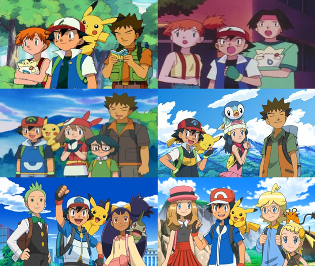 Este trío de protagonistas, inicialmente formado por Ash Ketchum, Misty y Brock, ha ido variando a medida que avanzaba la serie apareciendo personajes como Max, Aura o Maya, que han acompañado a Ash a lo largo de la aventura, en sustitución de los ya mencionados.