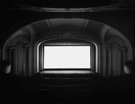 Del máximo interés es también el ejercicio que Sugimoto realiza en Theathers. Las distintas fotografías de esta serie muestran salas de cine durante la proyección de una película. La fotografía se ha tomado manteniendo el obturador abierto durante toda la proyección, es decir, permitiendo la sobreexposición de la imagen. A nivel visual, se consigue un efecto muy impactante, en el que se percibe la pantalla blanca y el resto de la sala tenuemente iluminada por la luz que proviene de esta, pero más interesante resulta en un plano conceptual: Sugimoto logra, a través de esta técnica, fotografiar el paso del tiempo.