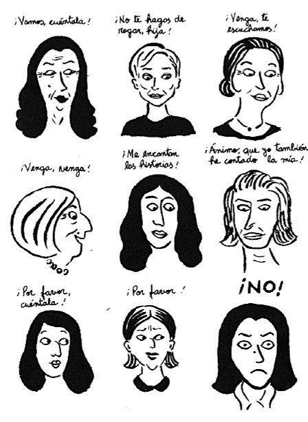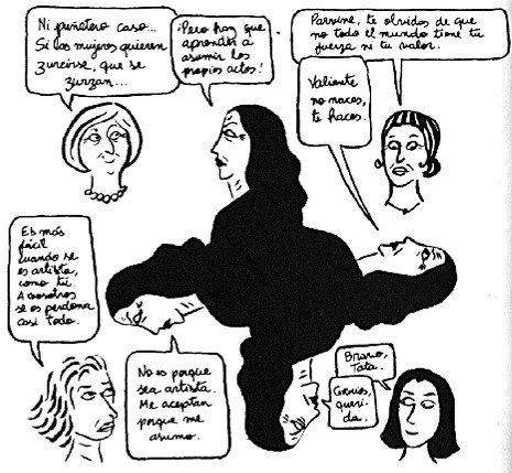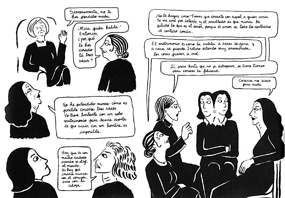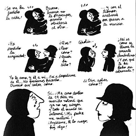 [1] En la primera página, vemos como el título (el original, en francés, es Broderies) posee un triple significado: “1. Bordado. // Adorno de un tejido o una piel con cosidos hechos en relieve. 2. Cotilleo // Difusión o narración de chismes entre varias personas. 3. Reconstrucción quirúrgica del himen para simular la conservación de la virginidad.” Satrapi, Marjane, Bordados, Barcelona, Norma Editorial, 2004, p. 1.