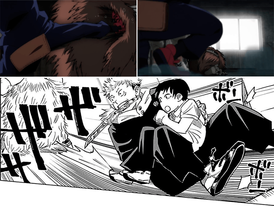 Comparación entre la reacción de Nobara, Fushiguro y de Yûji cuando este recibe la tozama en el manga (arriba) y en el anime (abajo).