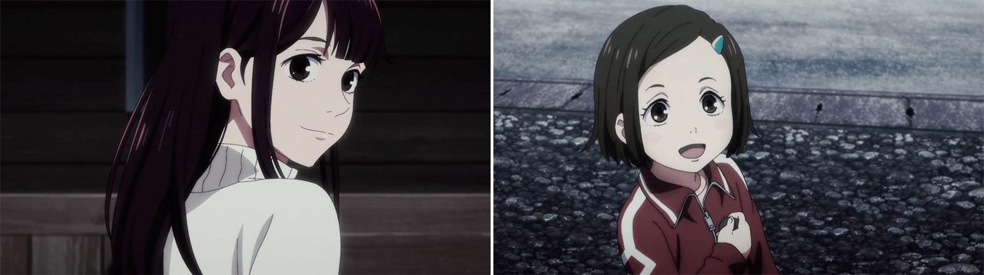 Primeras apariciones en la serie (tanto en anime como en manga) de Saori (izquierda) y Nobara de niña (derecha).