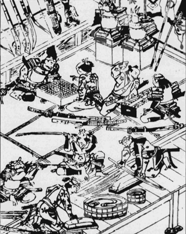 En la ilustración podemos observar algunos detalles del día a día de la guarnición. Aparecen cuatro samuráis jugando a distintos juegos de mesa, una pareja juega al go, y la otra al sugoroku, un juego similar al backgammon. Otro grupo de samuráis se encuentran afilando y revisando katanas y flechas.