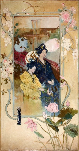 Pero lo cierto es que antes de que Romero de Torres fuera “El que lleva sintiendo la pena, el cantar de su tierra tan triste, y en los ojos de una hembra morena, vio el misterio que en Córdoba existe”, justo un año antes de que pintara la famosa Musa Gitana, pintó algo que para muchos resultará completamente inesperado: a un par de geishas paseando, rodeadas de un marco modernista.