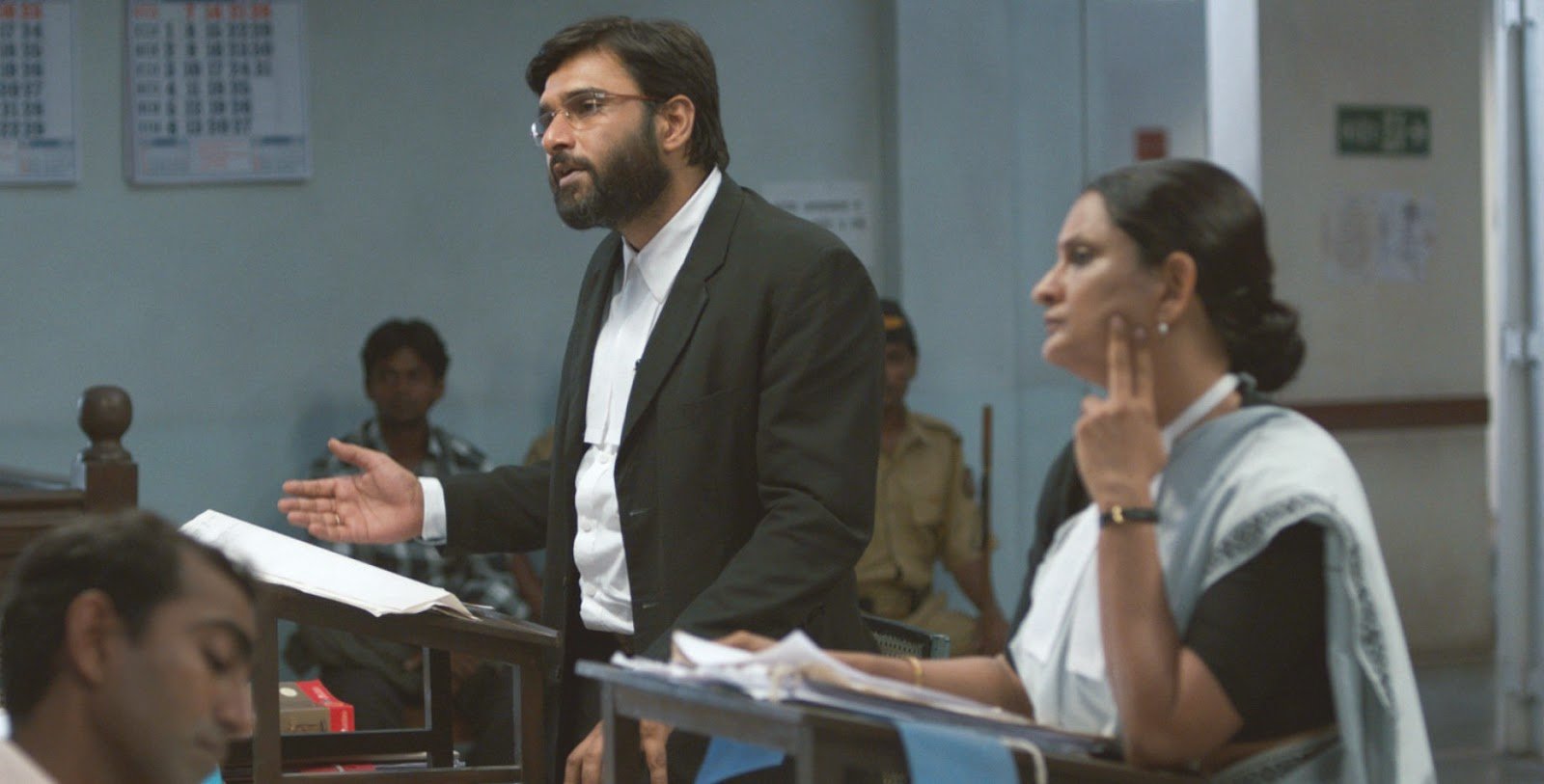 Quien, ávido de dramas judiciales, se acerque al filme en busca de intensos debates dialécticos, con maravillosos oradores que se enzarzan en los juzgados de una gran ciudad, enfundados en maravillosos trajes, definitivamente se ha confundido de película. No esperen la elegancia de Alicia Florrick (The Good Wife) o el cóctel de picaresca y carisma de Harvey Specter (Suits): estas afamadas series de televisión nos han preparado para esperar la excelencia de unos letrados formados en Harvard y curtidos en los tribunales de las metrópolis americanas, pero el Tribunal que nos presenta Tamhane resulta tan desolador como verídico. La fiscal presentará sus argumentos de forma repetitiva y técnica, leyendo directamente la ley, para hastío de toda la sala, ninguno de los abogados destaca por su oratoria ni sus capacidades, puesto que pierden documentos, no son capaces de encontrar a los testigos y su preparación es casi nula. A ello se une la obsoleta burocracia india, que permite dilatar el juicio del protagonista durante interminables meses, con pretextos absurdos que llegarán a exasperar al espectador.