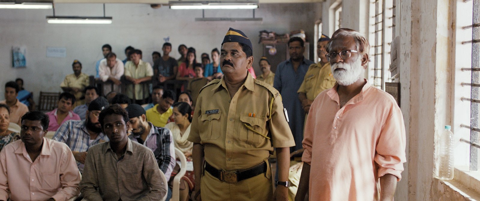 Narayan Kamble (Vira Sathidar), escoltado por un policía, se presenta ante el juez en la masificada sala donde se llevará a cabo el juicio.