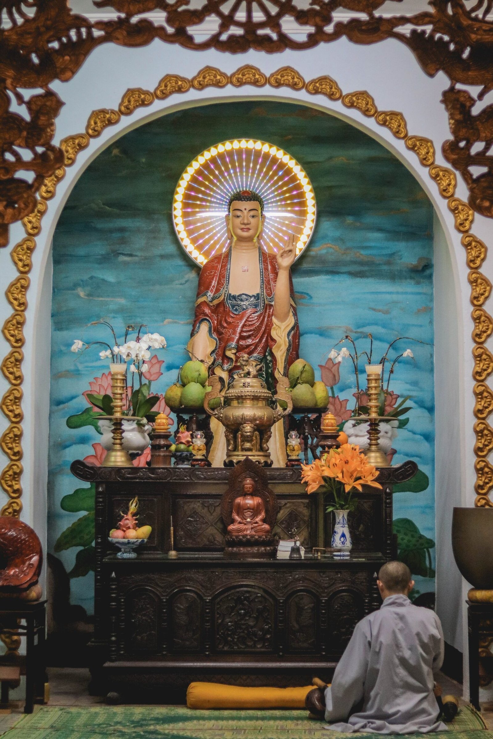 Fotografía de un hombre sentado ante un altar en Vietnam.