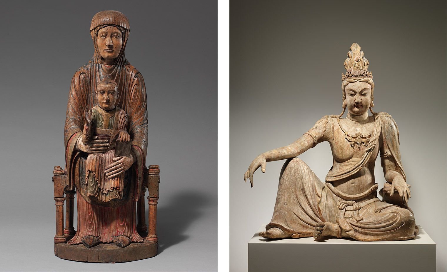 A la izquierda, Virgen trono con el Niño (1150-1200), originaria de Auvergne, Francia; a la derecha, talla en madera de bodhisattva Avalokiteshvara, de la dinastía Liao (907-1125), China. Ambas localizadas en The Metropolitan Museum of Art, de Nueva York. Fuente: MET Museum.