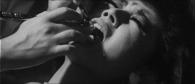 Famosa escena de la película Violated Angels (Okasareta hakui, Kôji Wakamatsu, 1967), donde el criminal descansa sobre las piernas de la joven, rodeados por los cuerpos de las enfermeras. Fuente: mubi.com.