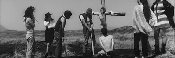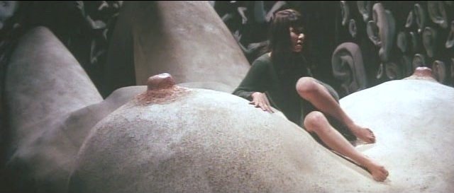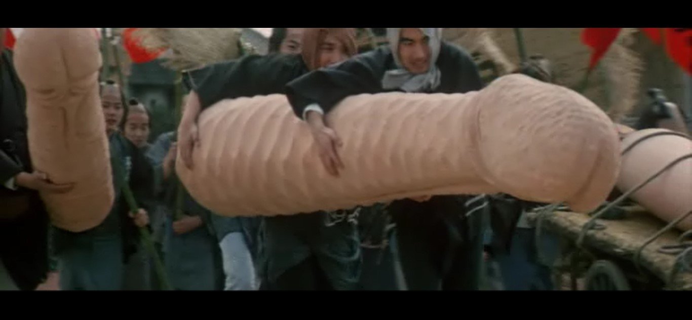Fotograma de El imperio del sexo (Tokugawa sekkusu kinshi-rei: shikijô daimyô, Norifumi Suzuki, 1972), perteneciente a una escena en la que el pueblo porta arietes de aspecto fálico.