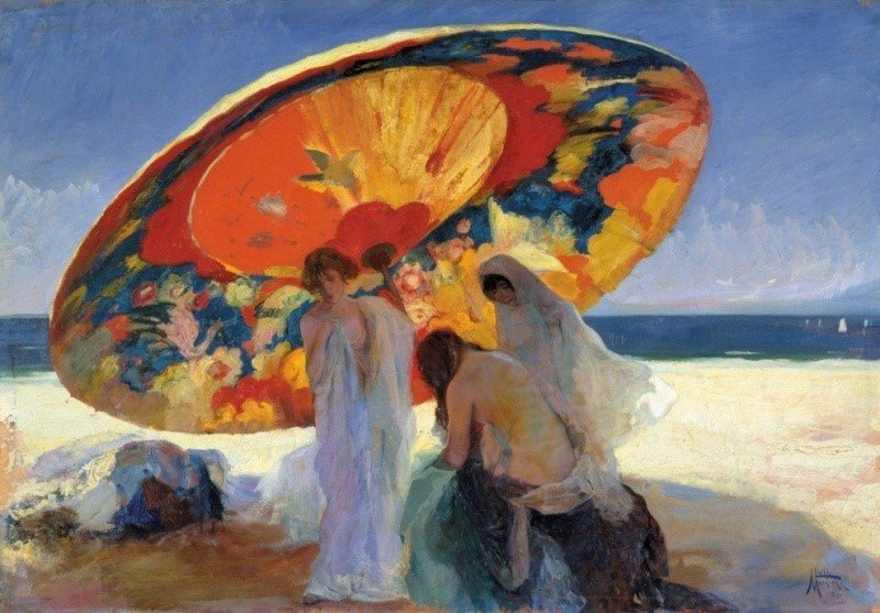 Esta pieza representa una escena amable en la que Lluís representa un paisaje costero, en concreto, una playa catalana a la que la familia Masriera acudía habitualmente en Sant Andreu de Llavaneres. En ella se ubican tres figuras femeninas bajo la sombrilla protegiéndose del sol, sus cuerpos quedan cubiertos por unas prendas de colores blancos exceptuando una joven cuyo torso y espalda quedan al desnudo. La gran protagonista de esta escena es la sombrilla, el mismo objeto japonés que se poseía la familia en su taller y que había sido adquirido por Josep. Una pieza de grandes proporciones con motivos florales y de pájaros exóticos, de un colorido fuerte, puro, sin modular que recuerda al tratamiento del color en los grabados japoneses. La sombrilla es el elemento que evidencia el gusto y la fascinación por la cultura oriental. Además, se trata de una obra en la que predominan los colores vivos y brillantes como el azul, el blanco, los rojos y los naranjas generando una obra muy colorista que recuerda a los esmaltes que el mismo artista aplicaba en sus piezas de joyería y que son conocidos como «Los esmaltes de Barcelona».