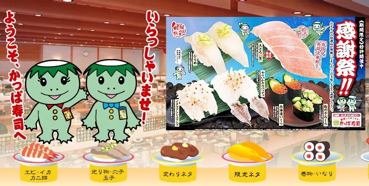 Otro ejemplo más de esta imagen comercial es la cadena de restaurantes Kappa-zushi. Su diseño del kappa comparte muchas características físicas con la representación que Toriyama Sekien hizo del kappa en su Gazu hyakkiyagyo: las manos y los pies palmeados, sobre su cabeza un cuenco pequeño rodeado de cabello, y sobre su espalda un caparazón. Aunque su boca no es en forma de pico y su cuerpo es redondeado y más pequeño. Mientras que la descripción de Toriyama lo muestra como un ser aterrador, el kappa de Kappa-zushi es una criatura sonriente que parece querer ser amigo de la gente. No hay sensación de peligro a su alrededor; son amigables y seguros para la familia, y una imagen adecuada para la empresa. Si hubieran usado un kappa como el de Toriyama Sekien, su eficacia se habría visto enormemente reducida, por no decir eliminada. La cuestión es que a la gente parece gustarle estar en presencia de estas criaturas.