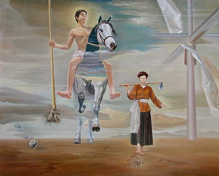 En el mismo año que La luciérnaga (The firefly, 2002), Dinh Dang realiza este lienzo. Es el único de esta etapa que introduce un tema mitológico, como lo es el cuento de Giong. No obstante, también se liga a la historia antigua de Vietnam, en la misma línea que La leyenda de la perla (The legend of pearl, 2000). La historia se enmarca durante la monarquía de Hung Vuon VI, en el momento que Van Lang (2524–258 a.C.), actual Vietnam, es invadido por el ejército de An. Quien detuvo la invasión y aquejó al pueblo de An fue Giong, fruto de la concepción divina de un matrimonio que vivía en la aldea Phu Dong, la cual es ubicable en Hanói.