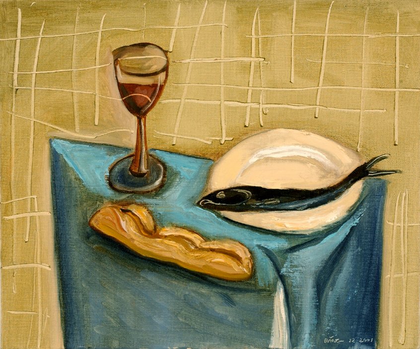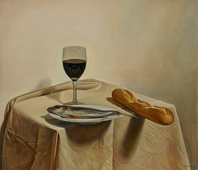 Se trata de uno de los muchos bodegones que realiza Dinh Dang en 2001 –de hecho, más de la mitad de los conservados pertenecen a esta fecha–. Está relacionado con la voluntad de reflejar la sangre y el cuerpo de Cristo; un tema característico de la producción del artista. El pez simboliza el ichthys.[1]. Mediante esta naturaleza muerta, Dinh Dang apuesta por las composiciones sencillas, donde no se inserta una gran cantidad de elementos –normalmente, de 2 a 5 motivos, sin incluir el soporte–.