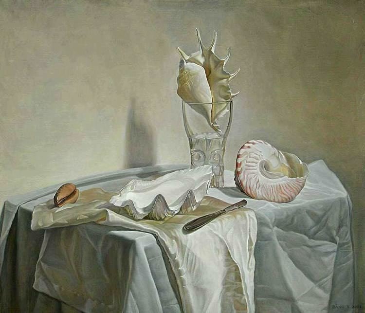 Por otro lado, mediante el marrón suave de la concha del cauri y de las sinuosas líneas rojizas del nautilus se incluyen toques de color que sirven para contrastar con la gama neutra, aportando un descanso visual. Este bodegón fue la primera obra que vendió Dinh Dang en Japón, en el mismo 2001, a través de su exposición individual. Un amigo del artista viajó de Vietnam hasta Japón con el propósito de acudir a la muestra de Dinh Dang y adquirió el cuadro.