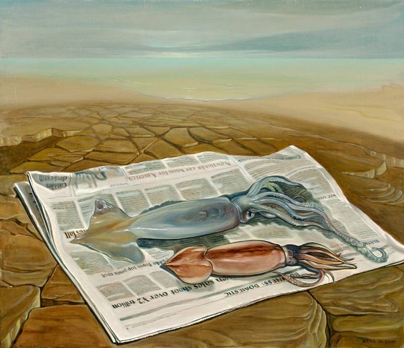 Calamar crudo y calamar hervido (Raw Squid and Boiled Squid, 2001) está a medio camino entre el realismo de minuciosos detalles, propio de La comida sagrada (The sacred food, 2001) o Sinfonía en blanco: las caracolas de la isla lejana (Symphony in white: the shells from the far island, 2001), y la simplificación de la realidad, con un cromatismo acrecentado que se verá en la siguiente categoría. No obstante, esta naturaleza muerta es más afín al realismo. Significa que Dinh Dang, en la misma fecha de factura, crea bodegones con una técnica muy diversa, lo que atestigua su gran capacidad plástica. Esta pintura, por otro lado, tiene una especial relevancia por su simbolismo. Dinh Dang cuenta la anécdota de que un día compró un calamar para cocinar, pero dejándolo olvidado, empezó a deteriorarse. Con el propósito de reaprovecharlo, lo hirvió. De ahí surge la idea de comparar un calamar fresco con uno cocinado, de color tostado y un tamaño mucho menor. Ambos se posan sobre un periódico en una tierra hostil donde el mar se encuentra muy alejado. Se trata de una denuncia hacia el consumismo y la desmesurada ambición humana.