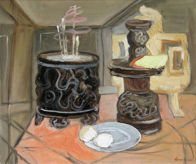 Se representan un par de incensarios encendidos asociados a prácticas tradicionales vietnamitas, estrechamente vinculadas a la religión. Es singular la forma de plasmar el humo como una espiral realizada mediante un único trazo, donde se insertan colores malvas y grises.