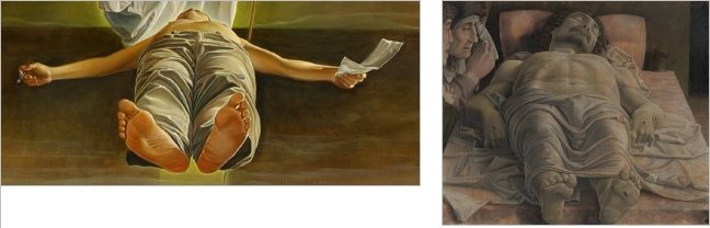 Detalle de La introducción del latín en Vietnam. La muerte trascendental del Sr. Nguyen Van Vinh (The introduction of Latin in Vietnam. Transcendental death of Mr. Nguyen Van Vinh, 2001). Lamentación sobre Cristo muerto, de Andrea Mantegna (1474).