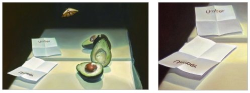 Por eso la mesa, situada en el margen inferior izquierdo, se duplica, sabiéndose esto por la liviana línea del espejo que distingue la realidad de la ficción visual. Los componentes que se posan en la misma también atestiguan la dualidad que se crea en el espejo, como por ejemplo la nota que lleva escrito ‘’Umber’’, la cual aparece representada al derecho y al revés.