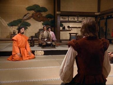 Uno de los primeros encuentros entre Martin Alvito y Blackthorne, una entrevista ante Toranaga para la que el jesuita sirve de intérprete.