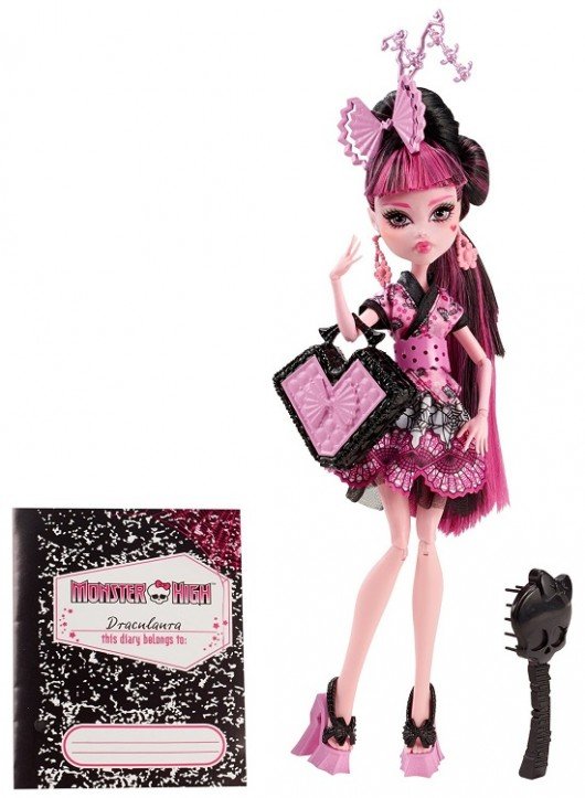 En este mismo año, salió al mercado una versión de Draculaura (la hija de Drácula) perteneciente a la colección Exchange Program o Monstruitas de intercambio en castellano, donde se supone que este personaje se dispone a viajar a Japón. Cabe destacar el hecho de que parece que se ha prestado mucha más atención a los detalles de esta muñeca que a la anterior, y eso que se supone que la primera procede de Japón. De nuevo, vamos a encontrar un recogido alto que se sujeta con un lazo compuesto por dos abanicos, adornado, además, por un kanzashi del que cuelgan pequeños murciélagos (no hemos de olvidar la naturaleza y el origen de este personaje). El atuendo está compuesto por dos partes: una blusa que imita el corte de un quimono -que incluso se cierra por el lado correcto- que se sujeta con un obi o cinturón, todo ello estampado con motivos florales que también remiten a las flores de cerezo. La falda, sin embargo, es completamente occidental, pero se adorna con un estampado en forma de abanico. El conjunto se completa con unos zapatos que pretenden emular los geta tradicionales, adaptándolos al estilo propio de la muñeca, por lo que nos encontraremos unas sandalias de plataforma de color rosa. Por último, llaman la atención unas pequeñas modificaciones en el tratamiento del rostro: las cejas son mucho más rectas y angulares, además, los labios se pintan en dos colores, reservando el tono más oscuro para el centro, intentando asemejarse a los pequeños labios del maquillaje de una geisha. Quizás la elección de este personaje tenga que ver con la influencia del Japón más popular en la configuración de algunos de sus atuendos caracterizados por faldas de vuelo y sombrillas a modo de accesorio, elementos que nos remiten al movimiento lolita.