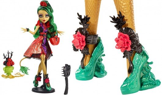 Una de las muñecas más llamativas e interesantes es la perteneciente a la línea New Scaremester (2013) o Semestre Monstruoso, que queremos comentar más detenidamente. A pesar de que la ropa de la muñeca es bastante básica y sencilla, sin remitir a nada concreto, los accesorios son ricos e interesantes. Partimos de los pendientes de Jinafire, en forma de farolillos de papel de color rojo, mientras que el bolso imita un abanico rojo y dorado con detalles de llamaradas y nubes grabados. El aspecto más interesante y cuidado de esta muñeca son los zapatos (algo que ocurre también en otras ediciones), con un tacón que representa a un león guardián[3] bastante detallado si tenemos en cuenta el tamaño reducido de la pieza; sin duda, uno de los calzados más cuidados y detallados de todos los ejemplares de Monster High en el mercado. Igualmente, el hecho de que se haya escogido el color verde, puede aludir al jade.