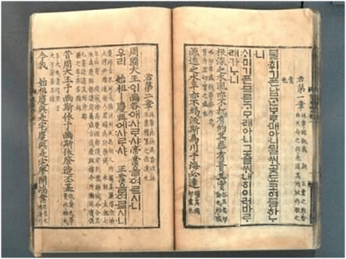 Imagen de un libro escrito en hangul (vocabulario coreano) y hyangga (caracteres chinos).
