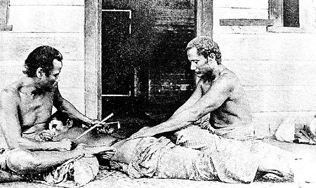 En 1767 el explorador inglés Samuel Wallis escribió en uno de sus informes[2]:”… es costumbre universal entre los hombres y las mujeres hacerse diferentes diseños de tinta negra en las nalgas y en la parte trasera de los muslos.”