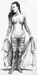 Dibujo de una mujer tahitiana tatuada.