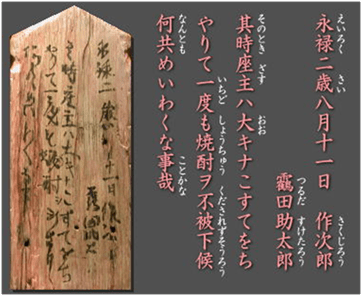 Placa del templo Kôriyama Hachiman y transliteración. (Fuente: Wikipedia)