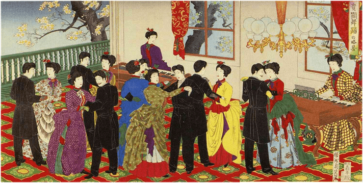 La Restauración Meiji (1868-1912) fue un periodo de profundos cambios en Japón. La transformación del país fue muy rápida y corrió paralela a su inesperada incorporación al selecto club de potencias industriales y coloniales. La creación de industrias metalúrgicas, textiles, químicas, astilleros y arsenales ocurrió a la vez que la occidentalización de las costumbres de los japoneses, primero de una selecta élite de funcionarios y comerciantes, posteriormente del resto del país. El gran amor del gobierno por el vals hizo que un periódico bautizara a los nuevos ministros como “el gabinete danzarín” (en inglés “The dancing cabinet”),[3] pero a este nuevo Japón no sólo le gustaba la música europea. La nueva moda trajo consigo la ternera, antes apenas consumida, los helados, la cerveza, el vino o la leche. Estas fiestas a menudo se celebraban en el pabellón Rokumeikan, un auténtico escenario de la alta sociedad tokiota de la era Meiji, que fue demolido en 1941.