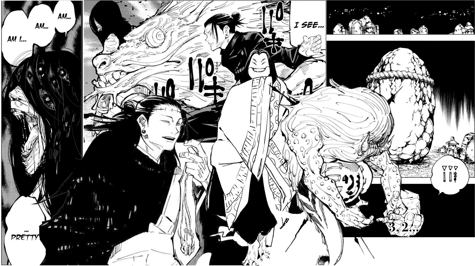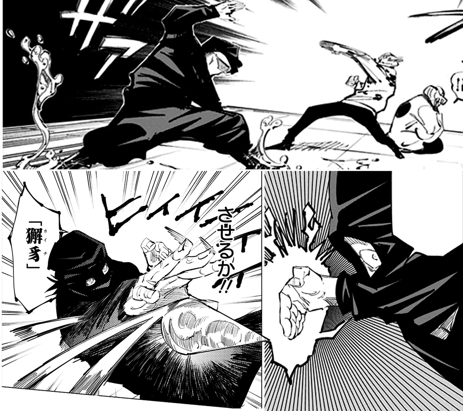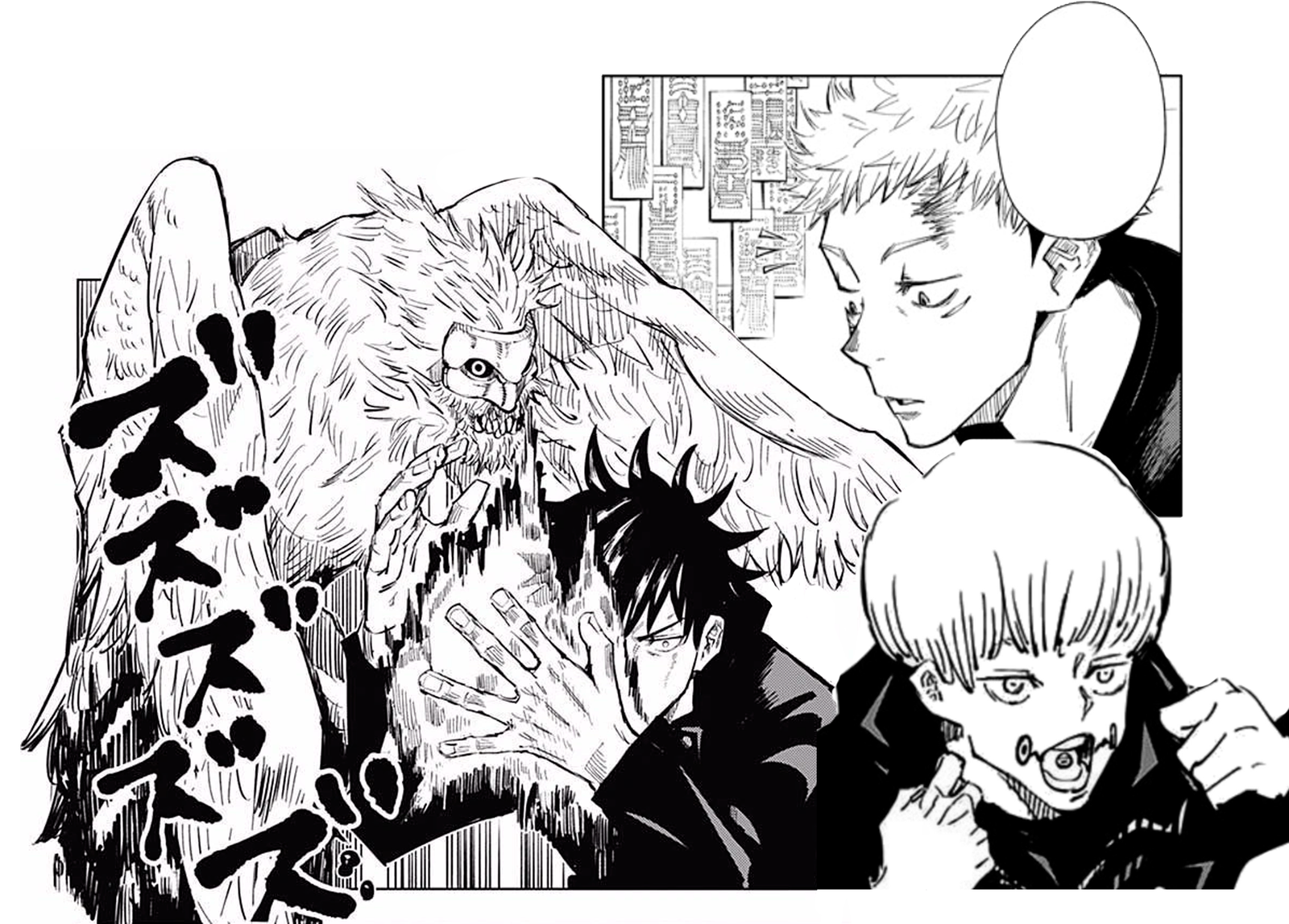 Fushiguro invocando a su shikigami Nue (izquierda), Inugami utilizando jugon (derecha) y Yûji encerrado en la habitación sellada con ofuda (centro).