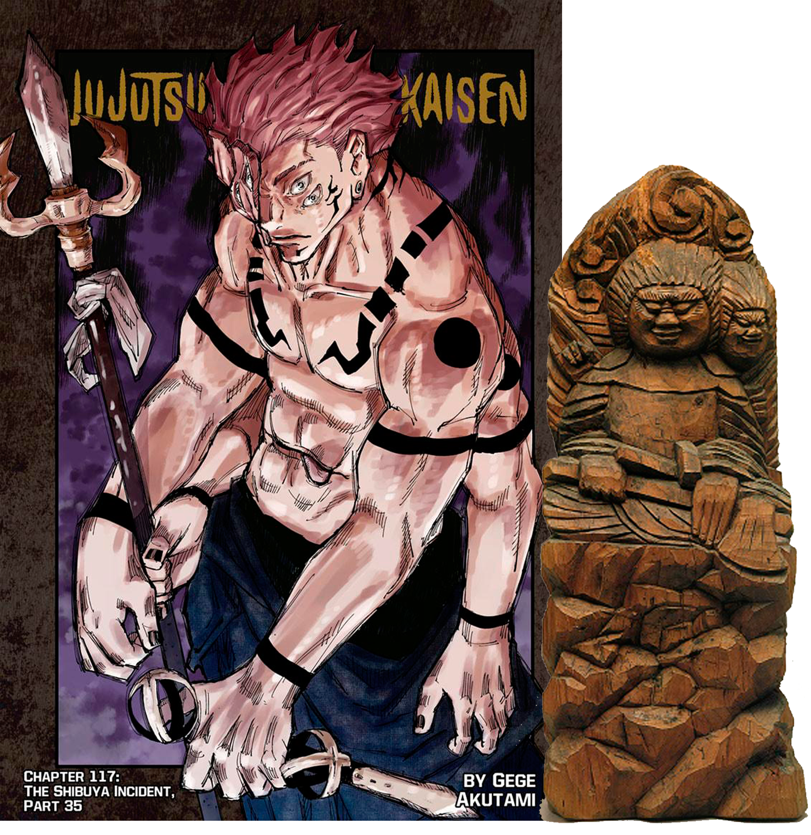 Sukuna en su forma original en el manga (izquierda) y estatua del Senkô-ji (derecha).