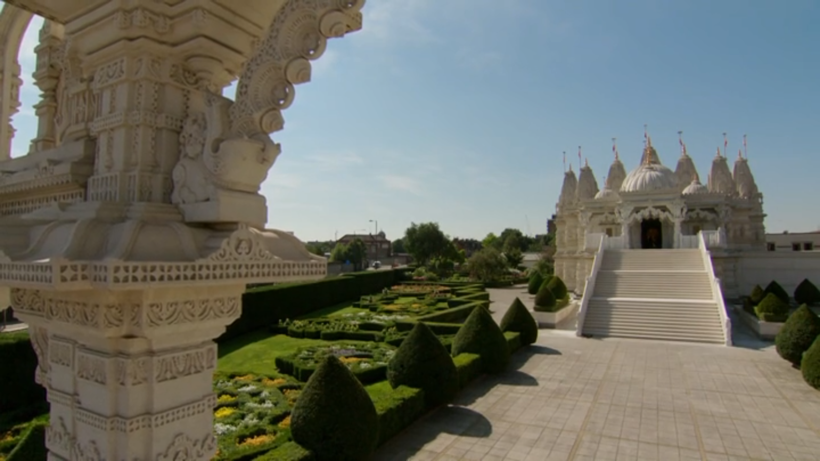 Fotograma del episodio de Gardeners’ World en el que se ve el espectacular templo hindú de Neasden y sus jardines.