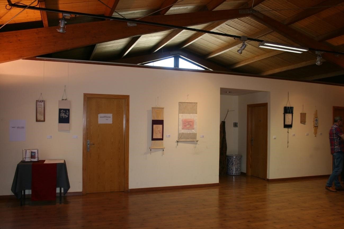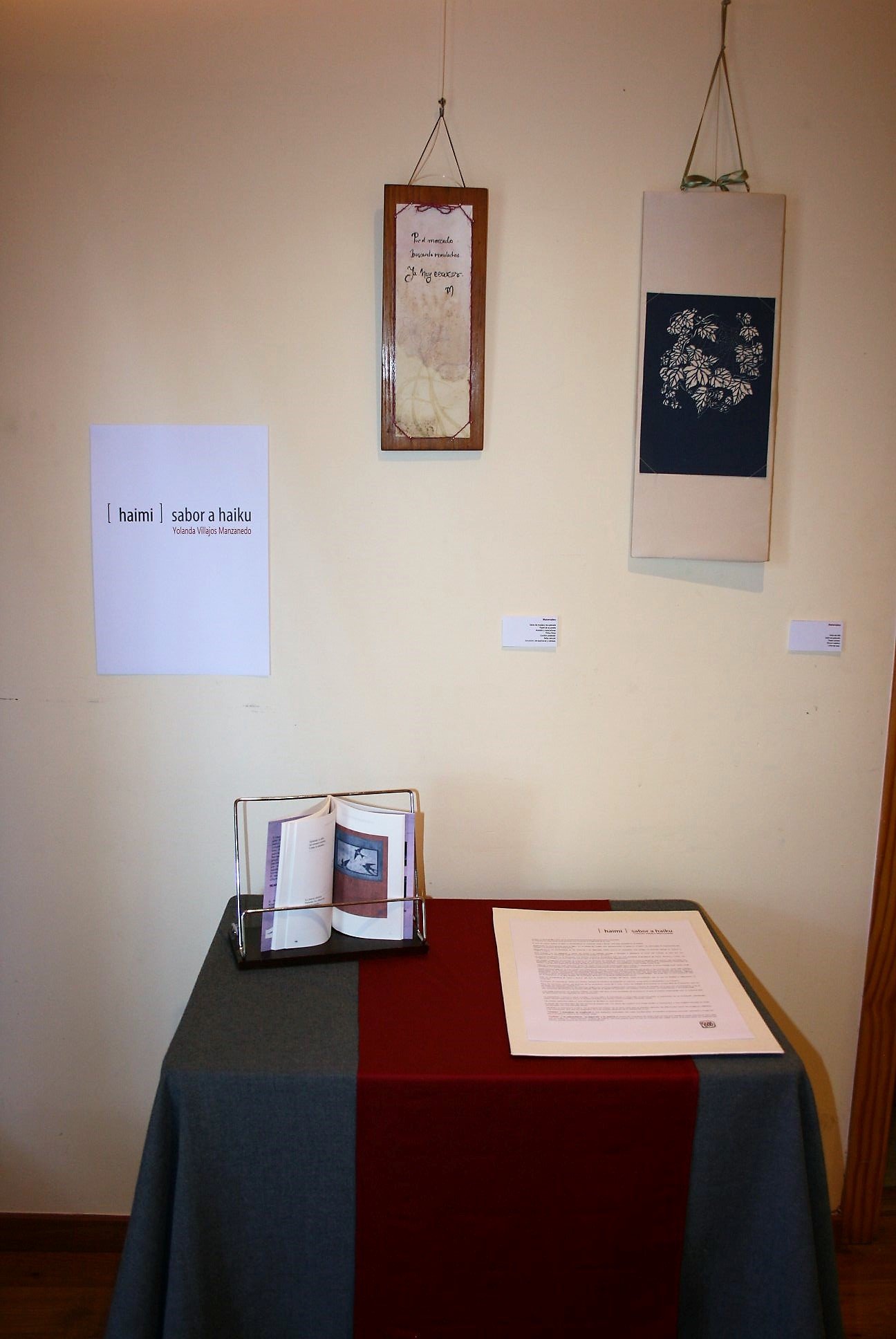 En realidad, en la exposición había siete piezas que no se corresponden con las diez imágenes del libro. Quería realizar una exposición que tuviera un discurso propio y ayudar a entender un poco la técnica y sus posibilidades. A modo de introducción, las dos primeras piezas son una placa de madera con haiga (haiku e ilustración) y una madera forrada en seda recuperada con una plantilla (kirie). También se encontraba el libro ilustrado en un atril, para que se puedan apreciar las diferencias entre las imágenes digitales y las expuestas, que son los originales tal cual quedan después de la exposición al sol.