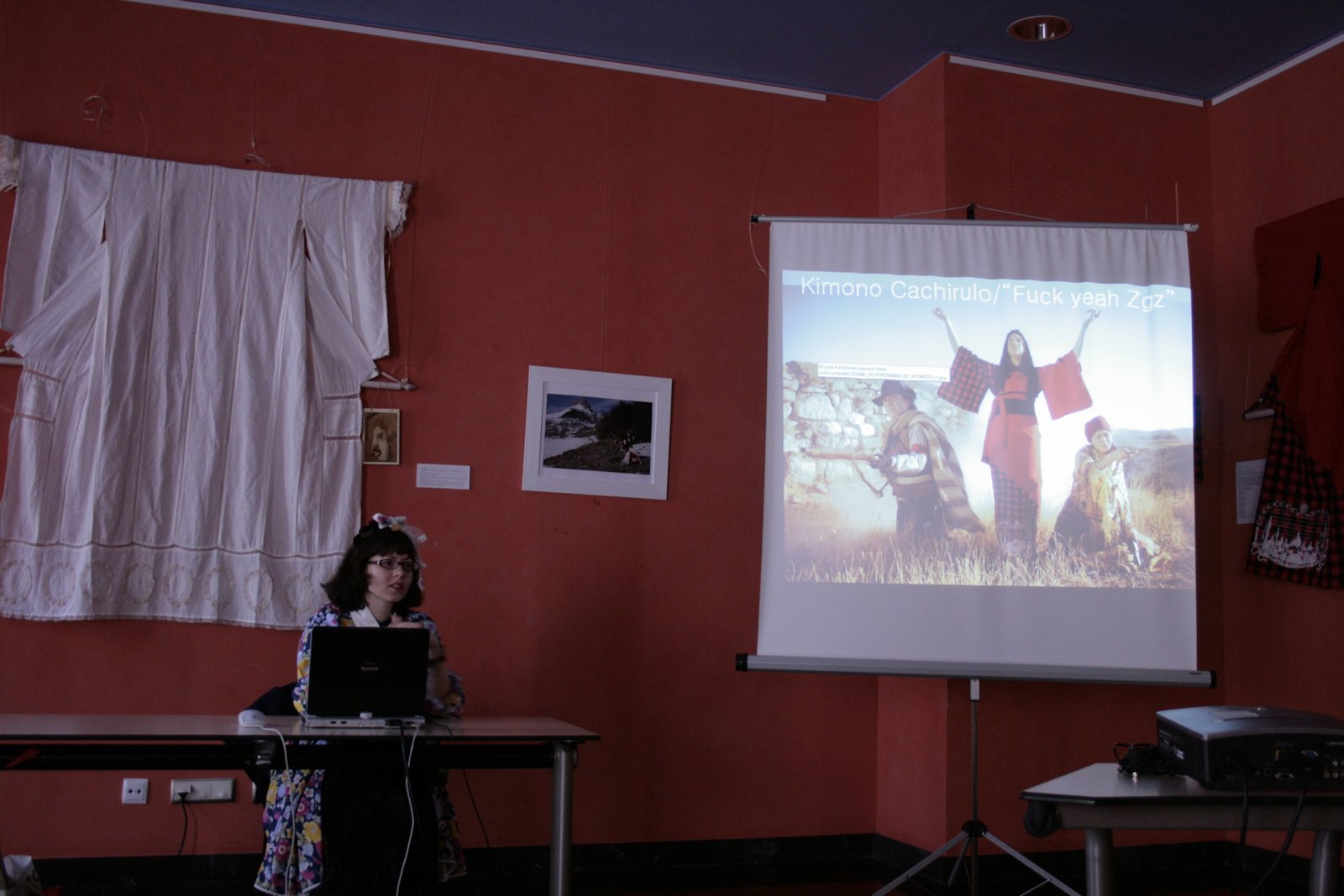 Villajos en una de sus ponencias, presentando uno de sus diseños de kimonos.