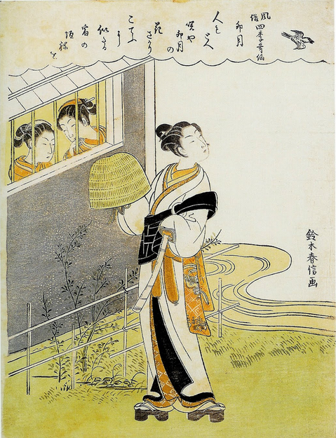 ‘El cuarto mes’ (h. 1768), grabado de Suzuki Harunobu, muestra a un joven disfrazado de monjekomuso ante dos hermosas muchachas. Este medio de camuflarse era habitual entre samuráis y jóvenes para viajes y correrías. El personaje porta un shakuhachi en su mano izquierda.