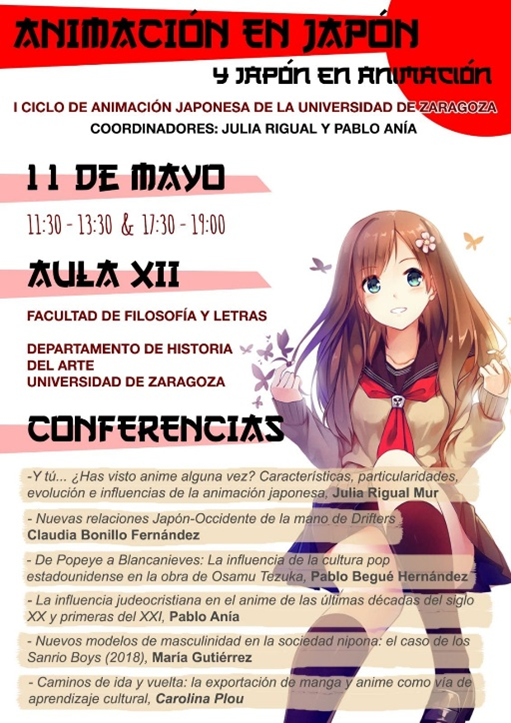 El pasado 11 de abril se celebró en la Universidad de Zaragoza el I Ciclo de Animación Japonesa, actividad cultural que surgió de la iniciativa de los doctorandos del Departamento de Historia del Arte de dicha Universidad, Julia Rigual y Pablo Anía, apoyados por los profesores del mismo departamento Elena Barlés y David Almazán. Este ciclo, que constituye una práctica complementaria a las asignaturas de “Arte de Asia oriental” y “Géneros audiovisuales” del Grado en Historia del Arte, entre otras, es el primero de su género en la universidad zaragozana, inaugurando una nueva cita anual que espera convertirse en un evento de referencia.