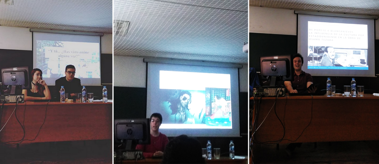 Las sesiones de la mañana se cerraron con la intervención de Pablo Begué, doctorando del departamento especializado en la cultura de masas, especialmente en los cómics. En su comunicación presentó la interesante, y a menudo malinterpretada, relación entre dos grandes personalidades de la animación: Osamu Tezuka, apodado el Dios del Manga, y Walt Disney. Su excelente exposición tanto de las circunstancias históricas que rodearon a estos dos grandes genios creadores, como de sus circunstancias personales y de sus influencias, ayudó a la audiencia a comprender no sólo las obras de estos dos carismáticos personajes, sino también a los propios artistas.