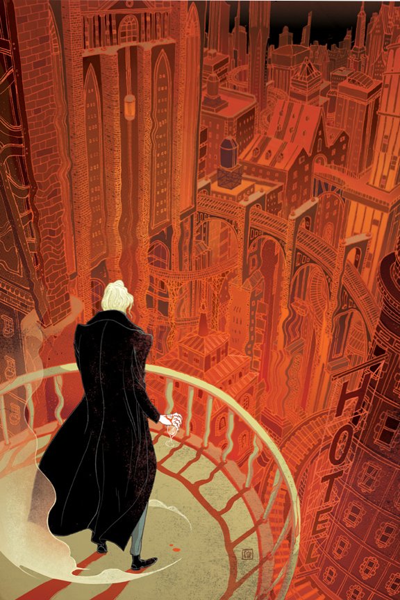 Portada de la obra Vicious. Victo Ngaiuna gran ciudad a los pies de una figura que destaca sobre el fondo rojo. Recuerda a obras steampunk o influenciadas por el cine de animación.