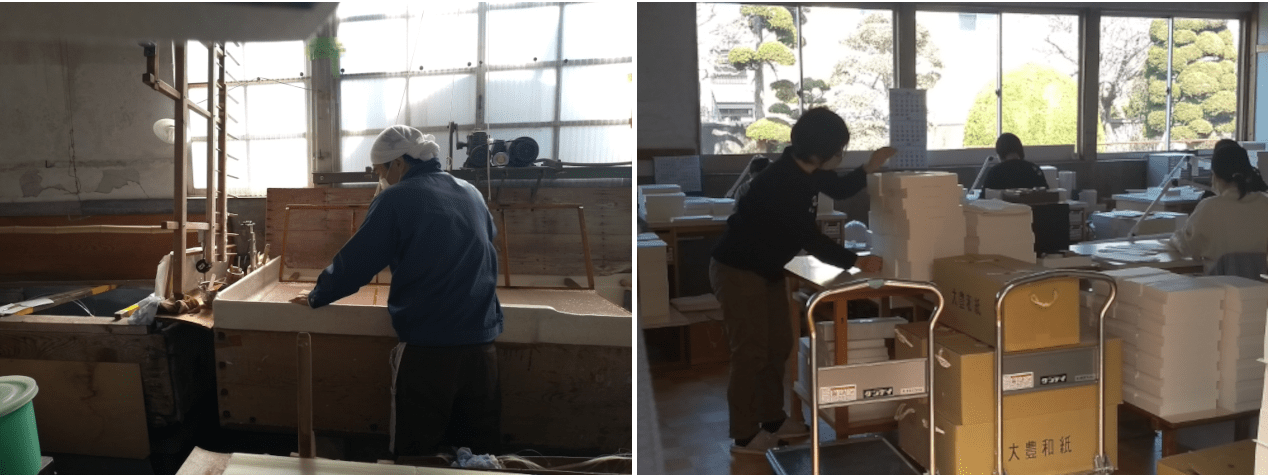 Fábrica de IseWashi, proceso de fabricación (izquierda) y de revisión (derecha) [fotos de la autora]