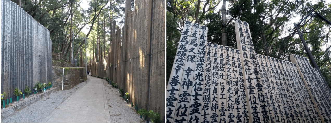 Además del honden o edificio principal, merece la pena seguir la pequeña cuesta que parte de una de las laderas del templo para acercarse a los sotoba, las láminas de madera pintadas con nombres que se colocan al lado de las tumbas y que han evolucionado de las estupas indias: de la misma manera que las estupas origianalmente guardaban las reliquias del Buda histórico, los sotoba marcan el lugar donde están los huesos del enterrado. Los sotoba de Asama-yama destacan por su gran tamaño, algunos alcanzan más de dos metros, y tienen la particularidad no estar al lado de las tumbas, sino colocados en larguísimas hileras a los lados del camino; una costumbre particular de la ciudad de Ise, de hecho, es la posibilidad de tener dos tumbas, una en el cementerio de la ciudad y otra simbólica representada con el sotoba en la cima de la montaña. El día después del entierro, es costumbre que la familia suba hasta la cima de Asama-yama y coloque una posesión preciada del fallecido en su sotoba, pudiendo verse gafas, rosarios, bolsos, muñecas y todo tipo de artículos personales.